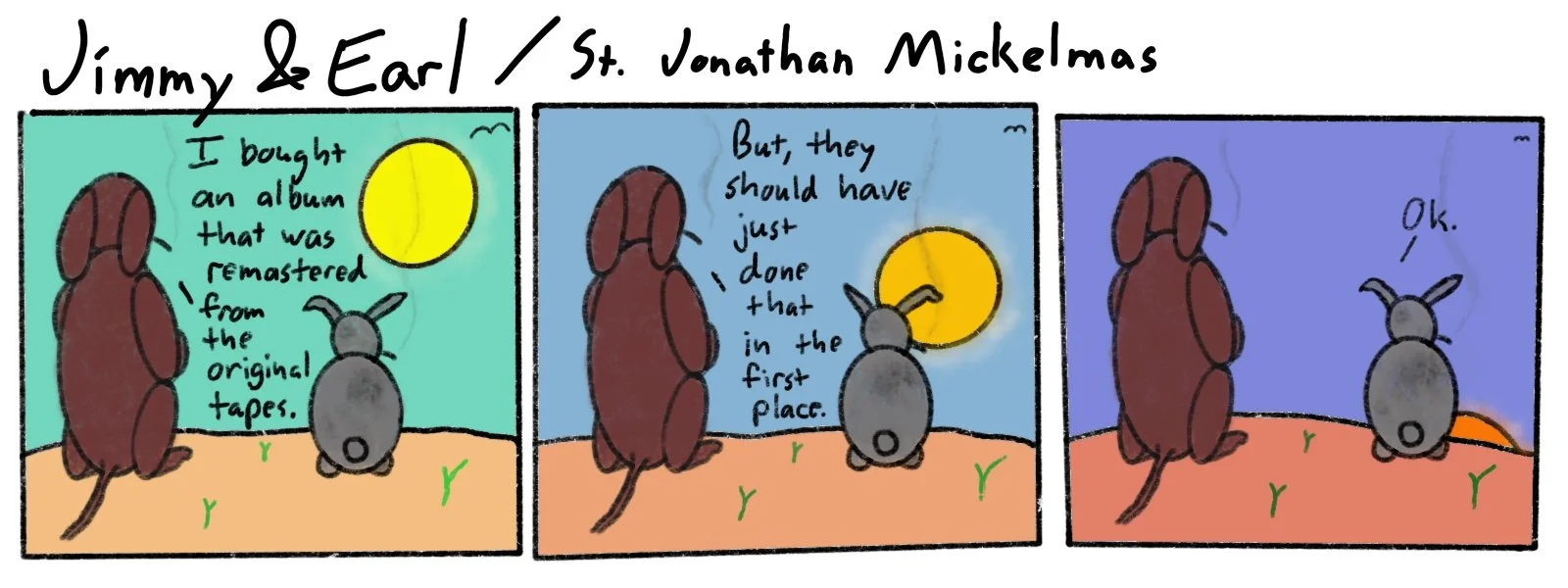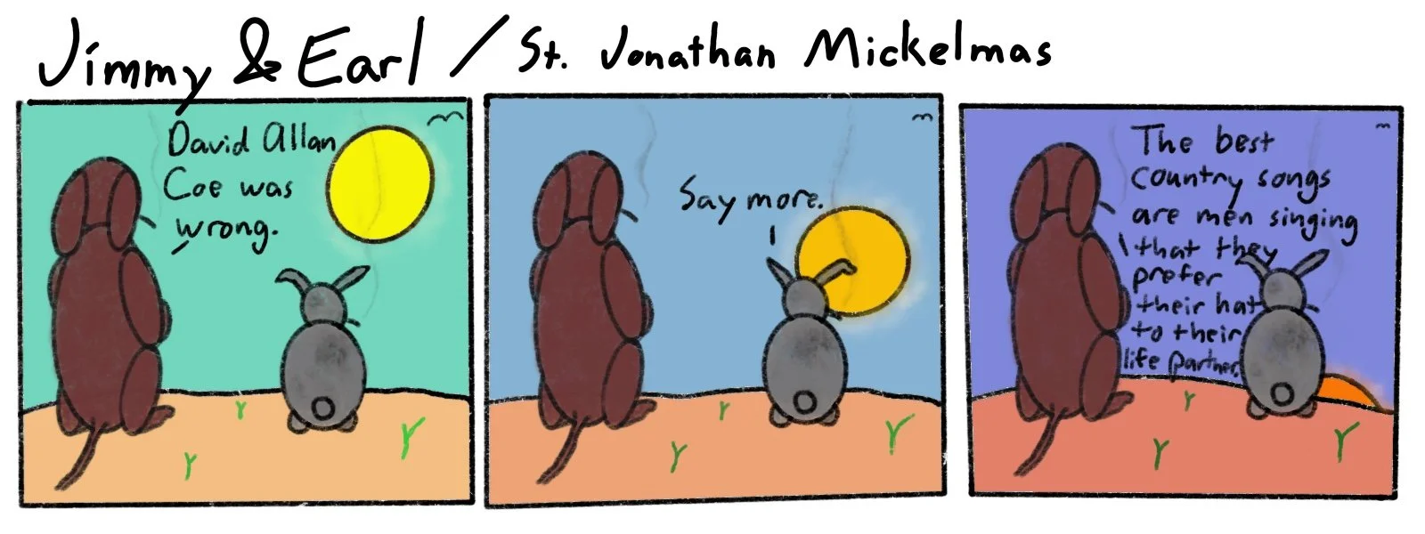 In acknowledgement on ongoing sensitivities, FruitSmoking is declining to run Jimmy & Earl No. 264. Furthermore, after a frank and earnest conversation with the author, St. Micklemas has agreed to make a financial contribution to a charity supported by those who may have been offended. Accordingly, he has donated $100 to the Patriarch Fund, which seeks to identify, medicate and subdue hysterical women. FruitSmoking looks forward to moving forward from this incident.